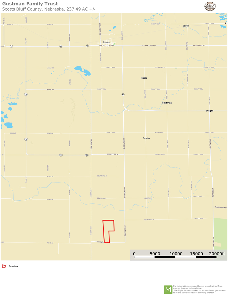 Research Parcel InformationFrom Lyman, NE follow Hwy 92 south for 3 miles. Then take a slight right to County Rd 3 and go south for 6 miles. Then turn west on County Rd S for 1 mile. The property sits on the north side of County Rd S.