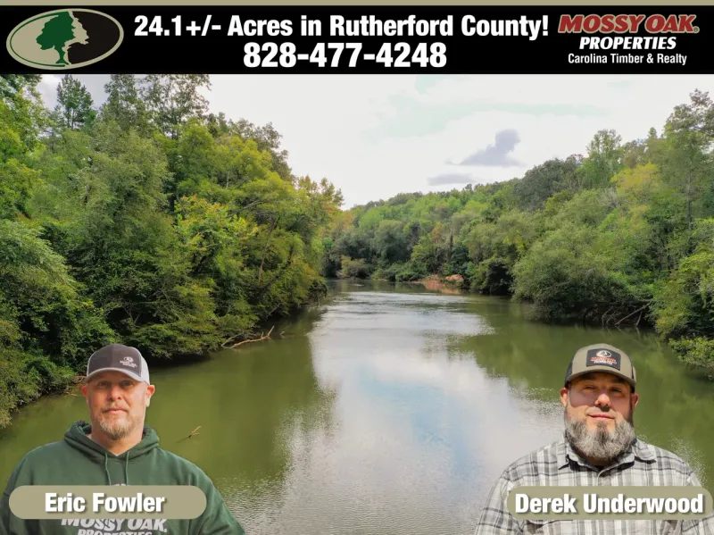 24.1+/- Acres with approximately 1000ft of Broad River frontage! Private access off Poors Ford Rd right on the Rutherford/Polk County line. Follow the cleared trail/proposed driveway up to one of several homesites or turn onto trail that follows the river to where an old self-sufficient cabin sits, that used to be enjoyed by family and friends until Hurricane Helene took it down. No restrictions imposed, so bring your creativity and build your private, waterfront dream get-away. The land was once terraced from the water to the top of the hill it sits on. So many opportunities to choose from. Call Eric or Derek at 828-477-4248 to schedule a showing!
