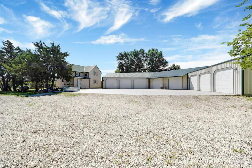 Enjoy country living on 24.26 scenic acres with a pond, mature trees, and a fenced homesite with an automatic gate opener. This 3 bedroom, 3 bath home features an updated kitchen with pullouts, a lazy Susan, and plenty of storage. The home also features a formal dining area, sitting area, spacious living room, bathroom which includes a classic clawfoot tub, and mudroom/laundry room all on the main level, while the basement, currently the primary suite, adds extra space and flexibility. There's a full bathroom and vault/safe room in the basement. Car lovers will appreciate the insulated, climate-controlled 8-car garage, and the large workshop offers a loft, bathroom, office, plus a party area. Additional highlights include a whole-house generator for peace of mind and a secure vault/safe room. A unique property offering privacy, and a place to enjoy outdoor adventures. Home is located off a paved road. Please call Julia Stone (785)2510746 or Stacie Danzer (785)3135280 to schedule a tour!