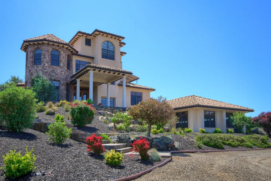 Custom 24 acre California foothill estate. The 7831 square foot, four story home has elevator and view decks on every level overlooking Bear Creek valley and surrounding hills.