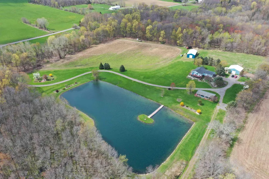 This property consists of a house, barn-shop, pole barn, and pavilion overlooking the 2 acre pond. The house was built in 1991 and includes over 1,400 sq. ft., 3 bedrooms, and 2 full bathrooms. There are 2 bedrooms upstairs with one of the bedrooms being the master bedroom, and a full bathroom. The kitchen and living-dining room are a spacious open concept area. The downstairs is a partially finished basement which includes another bedroom and a full bathroom. Washer and dryer hook ups are upstairs and downstairs. The basement has ingress and egress allowing you to turn the downstairs into additional living space including a potential mother in-law suite. There is an attached 2 car garage with a large mudroom. The house has a septic, well, and natural gas.