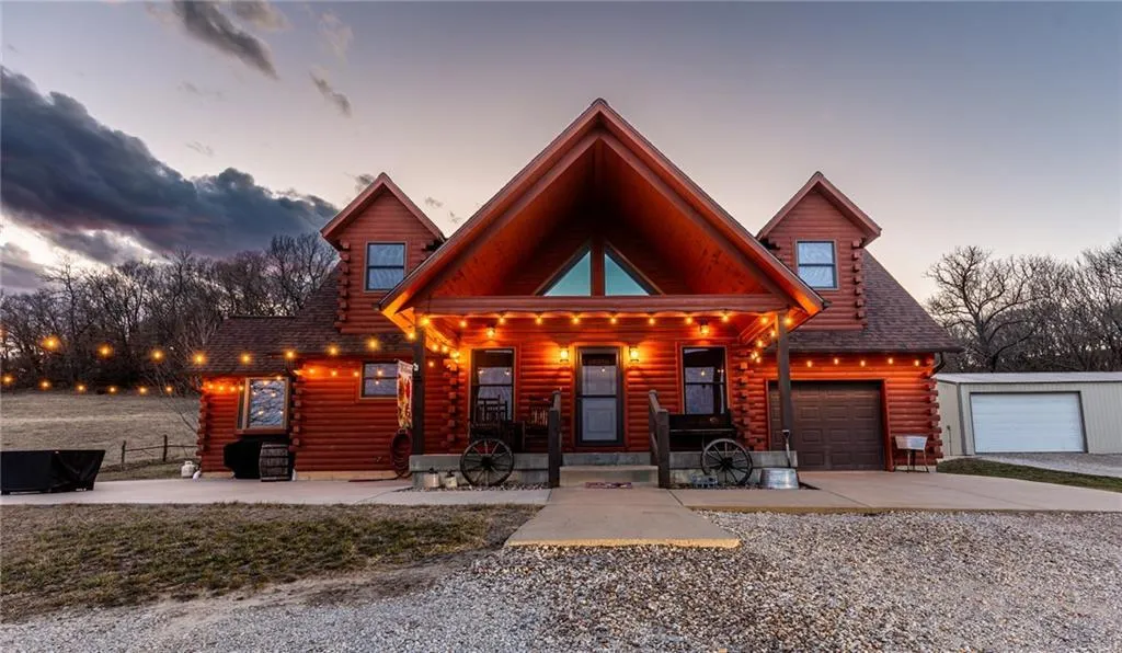 Beautiful custom built hillside log home on 24 acres M/L. Built in 2005: the home has 4 bedrooms, 3 full baths, and 1 half bath. The main level features cathedral ceiling's, kitchen, dining room, master bed & bath, and laundry room. Upstairs you will find 2 bedrooms, 1 bath room, and an entertainment area complete with a slate pool table. The basement boast a second living area with a rock gas fireplace, safe-room, bedroom, full bathroom, & tons of storage. Outside you'll find a 50 x 30 shop with concrete floor & electricity. The 24 acres M/L is fenced for livestock. This is a meticulously kept property with some of the best views you'll find in Eastern Kansas. If you are looking for a custom built forever home this is it!