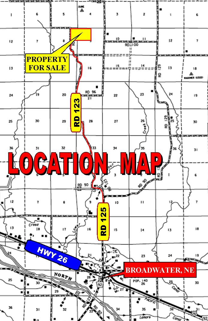 LOCATION: From Broadwater, NE, Rd 125, 8 1/2 mi N to the SW corner of the property, which is on the E side of the road. (Rd 125 turns into Rd 123).