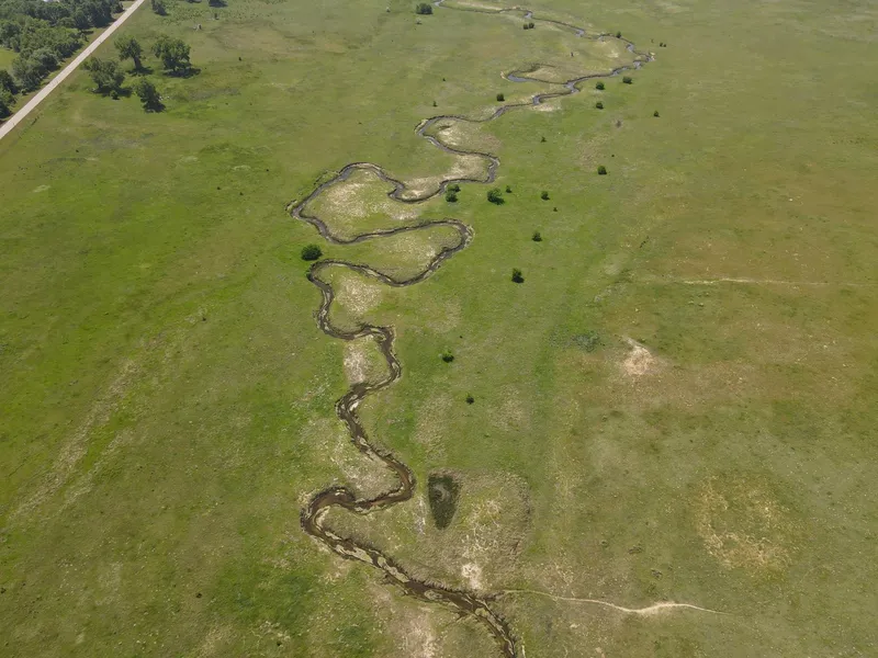 This 240-acre tract is all native grass and is ready for grazing with thick grass. Silver Creek runs through this property from south to north, and there is a natural pond on the west side of the tract. The fences are older, but in good shape. The grass is thick and is ready for grazing. There are paved roads on the east and south sides of the property. This area is also strong for deer and other wildlife. This is a nice diversified tract of land.