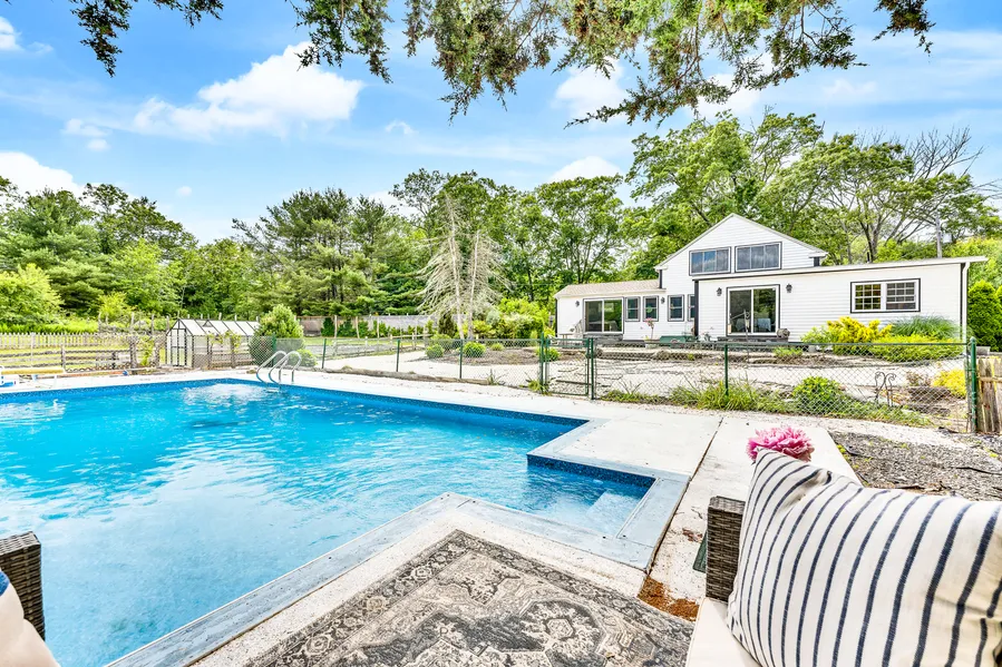 Outside, a crushed shell wraparound driveway and expansive patios with detailed stonework are bordered by a lush landscape with native trees and specimen plantings. To one side of the house, a garage space has been converted into a studio ideal for making art or practicing yoga, with a loft above, and to the other side, a barn and fenced pasture neighbor the raised beds and garden space. An inground swimming pool takes advantage of the sunniest central location behind the house, while meadows and stone walls stretch out to the edges of the woods.