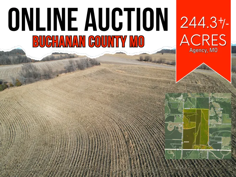 Description: Buchanan County Missouri Row Crop just East of Agency Missouri. This farm is a rare sizeable, highly tillable row crop farm with quality soils. With road frontage on three sides, this farm has several quality building sites and easy access to farm. Currently the farm is used for row crop production with some pasture/hay. New owners could increase the tillable acres if they choose to do so. Farm has some terrace and tile work performed.