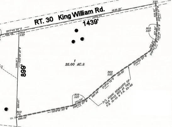 25 acres on State Rt. 30 located 11 miles west of I-95 Doswell/ Kings Dominion. Wooded tract, level to gently rolling terrain. About 5 acres have been cleared of undergrowth, entrance from state road installed. Agricultural zoning, conventional perc. Owner financing available with onlt $1,500 down, $1283.48 mo.,20yrs/10%apr