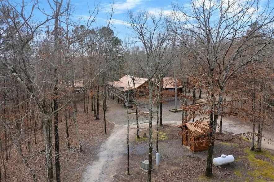 This cozy log cabin retreat is nestled on 25 acres (MOL) of unrestricted land, providing the perfect blend of privacy and natural beauty. As you approach the entrance gate at the end of the road, you'll find yourself enveloped by towering oak and pine trees and the tranquil sounds of Lukfata Creek gently flowing nearby. The cabin itself boasts three bedrooms and two bathrooms, it is a typical log wood cabin design, offering ample space for guests to unwind and relax. Its rustic charm is accentuated by the warm wood tones and inviting atmosphere. Each room is thoughtfully appointed with comfortable furnishings, ensuring a restful night's sleep after a day of adventure. One of the highlights of this property is the 24x24 unattached covered outdoor kitchen, where guests can gather and enjoy dining in the crisp mountain air overlooking the creek running just across the property line. Equipped with a gas grill and a full kitchen featuring granite countertops, it's the perfect spot for cooking up a delicious meal while taking in the serene surroundings. Whether you're grilling burgers with friends or just enjoying morning coffee the outdoor kitchen provides all the amenities you need to create memorable culinary experiences. And with unrestricted land to explore, guests can embark on hiking trails, fishing, swimming, hunting, wading, or simply relaxing and reconnecting with nature. For those seeking total seclusion and a retreat from the hustle and bustle of everyday life, this short-term rental cabin offers the perfect escape with tons of potential for anything a new owner can dream of. Furnished, turn key ready for a new owner to enter the STR world or a private oasis for a family.
