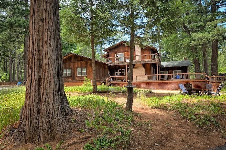 A private gated entrance leads you to this grand, spacious home tucked away on 25 wooded acres with four ponds in a gorgeous mountain setting. There is also a 2700 sf metal shop building with 3 roll up doors, office and upstairs storage area. The home features beautiful hand crafted wood beams which decorate the living room and master bedroom ceilings. The rooms are large and features include high ceilings, hand carved doors, antique hardware, and hardwood floors. Add an Armoire in the library/study and it becomes a 4th bedroom. Primary bedroom has 2 full bathrooms each with a walk in closet. Two bedrooms upstairs with a living space and a full bathroom. The property is surrounded by timbered forest and backs up to Sierra Pacific land.