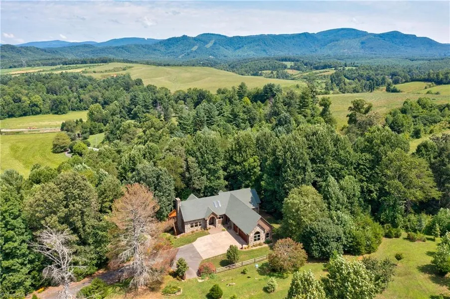 Spectacular home on 25 acres in Traphill. Long winding paved driveway takes you past a fenced pasture with a creek running through the trees where it's shady enough to sit on a hot day & soak your feet! The home boasts a wide open floor plan with natural slate & wood floors, floor to ceiling Pella windows to take in the beautiful views of the woods surrounding the property. The oversize fireplace in the great room is made from 3 different rock styles. The kitchen has quartz countertops & copper accent & an extra large built-in refrigerator. The large owner's suite has doors leading outside to the deck & the expansive bath has a soaking tub and large walk-in shower. The 4 double outside French doors in the home all match upstairs & downstairs to create a uniform look within the home. Downstairs is a large entertainment room & bedroom with outside entrance & full bath. This home is unique & very private, yet minutes away from Elkin, N Wilkesboro & an hour from Boone.
