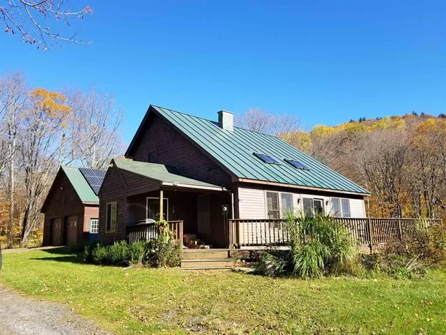 This pretty open concept 3 bedroom, 2 bath, timber frame saltbox home is located on 25 acres. 2 bedrooms and bath on 2nd level, a bedroom and bath on the 1st level. Kitchen is spacious with plenty of cherry cabinets. It's open concept between kitchen, dining and living room. There's plenty of natural light that shines through from the skylights, windows and French doors. The French doors open to a wrap around deck perfect for watching the wild life and with mountain views and it's a perfect place for entertaining. Cellar and garage are awesome! Garage is 32x30, insulated, 2x6 construction including the roof, with storage on 2nd level, 10ft ceilings with 8 foot doors. Garage comes with a propane heater. There are enough solar panels for a heat pump so you can heat or have AC for your home if you want. Basement as well has 8 foot ceilings and a walkout slider. This home is located within a half mile of ATV/snowmobile trails and between ski areas Sugar Bush and Killington. A perfect spot for vacation retreats or a year round residence.