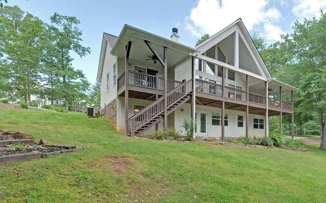 Lake Access Beauty. This home offers a wonderful open floor plan with lots of doors and windows to let nature in. High Cathedral ceilings grace the Great Room and Master Suite. Granite counter tops in kitchen, Large closets, Laundry room on the main floor. Covered viewing porches with large sliding doors. Finished lower level offers a drive under, oversized garage,Ample workshop area and storage, BIG den with showcase shelves, BR and BA. Low maintenance vinyl siding and stone on the exterior. Storage shed and Boat Parking too. Circular drive, landscaped yard and fire pit. Private boat ramp for residents. Home can be purchased via ASSUMABLE VA LOAN!!