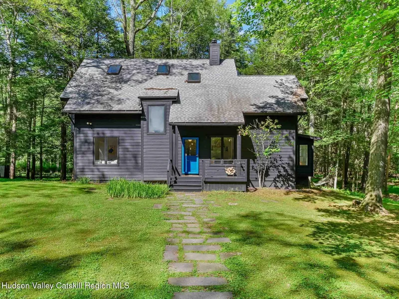 Nestled on one of Woodstock's most sought-after roads, this stunning three-bedroom, two-bath contemporary home, with over 2,000 square feet of finished space, harmoniously blends modern design, thoughtful updates, and serene natural surroundings. Privately situated on 3.17 acres, custom trails, a boardwalk, and a tent platform are installed, making it a nature lover's dream. The striking dark-stained exterior is complemented by a vibrant Yves Klein Blue front door, which hints at the stylish interiors. Step inside to discover an inviting open floor plan designed for comfort and functionality. The double-height living room is a cozy yet dramatic centerpiece, featuring a wood-burning fireplace and abundant windows that fill the space with natural light. The adjacent kitchen is as practical as it is chic, with sleek cabinetry, maple countertops, and updated appliances, creating an inspiring setting for culinary endeavors. An open dining area flows seamlessly into a sunroom, which leads to a recently updated deck with cable railings perfect for indoor-outdoor living and entertaining. The first floor also includes a flexible space currently used as a media room. With an oversized closet and jack-and-jill access to a full bath, this room can efficiently serve as an additional first-floor ensuite bedroom. A conveniently located laundry area adds to the home's practicality. Upstairs, you'll find three well-sized bedrooms equipped with efficient ductless split units for year-round comfort. The second floor also features a large, updated full bath. Ascend to the third floor to discover a beautifully finished space currently used as a home office. This light-filled retreat boasts oversized skylights and another ductless split unit, offering an inspiring and versatile area for work or relaxation. Over the past decade, the owners have meticulously maintained and enhanced the property with numerous upgrades, including insulation, a whole-house generator, a new roof, a water filtration system, fresh paint, and landscaping. A complete list is available upon request. Located just minutes from Woodstock's vibrant town center and the waterfalls, creeks, and nature preserves that define the area, this home provides the perfect balance of convenience and tranquility. With easy access to Saugerties, Kingston, and Amtrak station, the John Joy Contemporary is a rare opportunity to live in style and comfort in the heart of the Hudson Valley/Catskills Region.