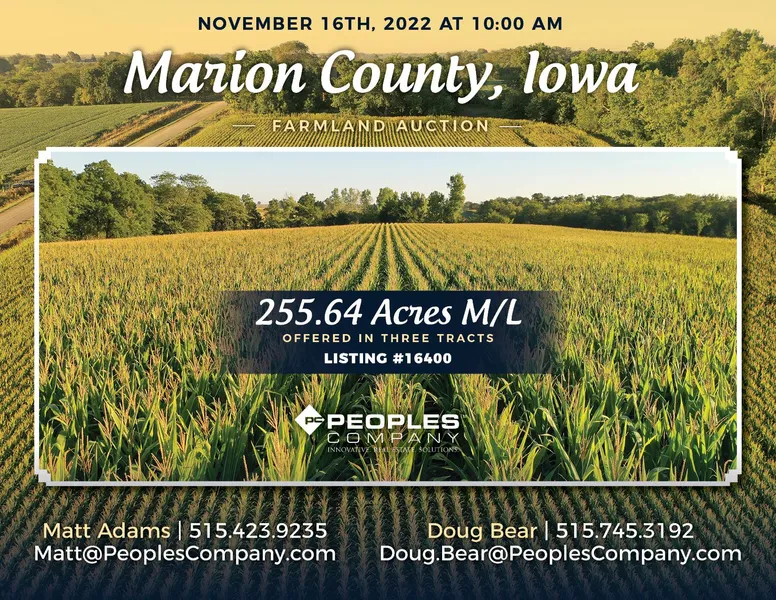 Marion County, Iowa Farmland Auction on Wednesday, November 16th, 2022 at 10:00 AM! Peoples Company is pleased to present 255.64 total acres m/l located west of Knoxville, Iowa, and southeast of Pleasantville, Iowa. This farm is situated just minutes south of the paved four-lane Iowa Highway 5 and offers productive soil types for row crop production, prime recreational opportunities for outdoor enthusiasts, and multiple locations to build that are suitable for nearly all home types and walkouts for people looking to build their dream home in a secluded location. Just a short drive from Knoxville, Indianola, or the Des Moines metro area, this is a rare opportunity to purchase contiguous tracts of Marion County tillable ground, recreational land, and hunting land all in one!