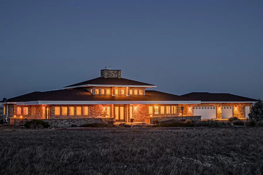 Unique home embodies the serene & private Wyoming country lifestyle! Yet only 25 minutes from Cheyenne. On 35 acres, marvelous all-brick Frank Lloyd Wright-style architecture is like no other in region. Views from every window. Large entry & main living areas are dramatic, with vaulted & beamed ceilings. Impressive open floor plan. Basement ready for your creative finish. Massive courtyard perfect for relaxation & entertaining.