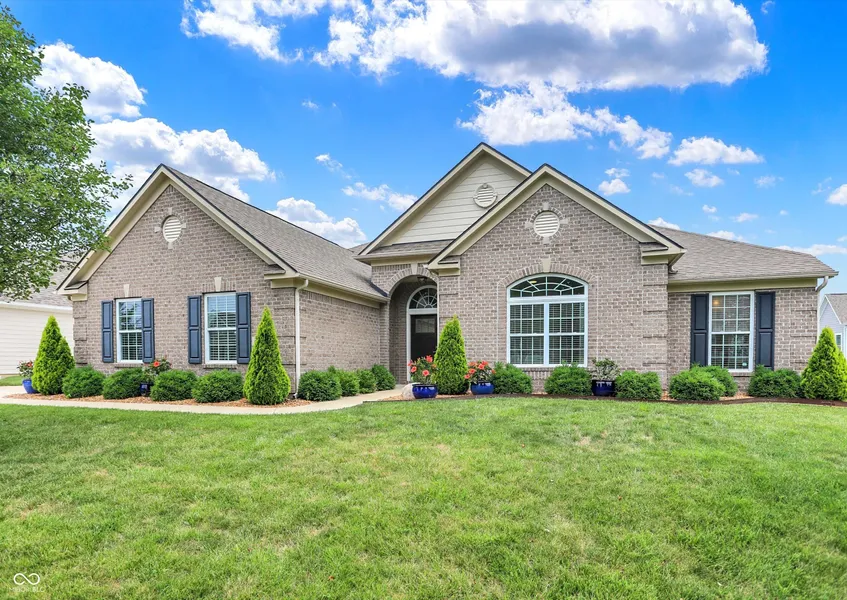 Welcome to this beautifully maintained 3BR & 3 full BA ranch ideally located adjacent to the Village of WestClay in Carmel! Step into the gourmet kitchen featuring granite countertops, custom cabinetry, stainless steel appliances, tile backsplash, and a spacious walk-in pantry with custom shelving. The open-concept design flows seamlessly into the family room with built-ins, creating a perfect space for entertaining or everyday living. A dedicated office/den provides a quiet workspace but can easily be converted back into a 4th bedroom. Additional highlights include a full laundry room with utility sink and storage cabinets. Outside, enjoy serene pond views from the rear patio, a fully fenced backyard that accommodates pets or play, and an irrigation system to keep the lawn green. Low-maintenance & luxury living in one of Carmel's most desirable areas at Hadley Grove!