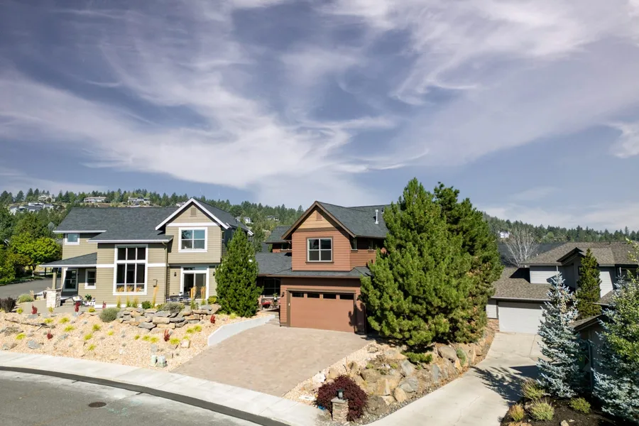 Located in NW Bend and just minutes from downtown, the Deschutes River, trails, shopping and dining, this home is ideal as a primary residence or a ''lock-and-leave'' getaway. A charming front porch, heated paver driveway, and low-maintenance landscaping create great curb appeal and everyday ease. Inside, soaring ceilings, hardwood floors, and an open great room connect living, dining, and kitchen spaces seamlessly. Four bedrooms and three full baths provide plenty of room to gather or retreat. The primary suite offers sweeping views to the east over the city and west toward Awbrey Butte. Updates like fresh paint, new carpet, modern lighting, and hardware give the home a refreshed, move-in ready feel. Enjoy mountain air and privacy from the peaceful patio and deck. Style, comfort, and location come together in one well-rounded package.