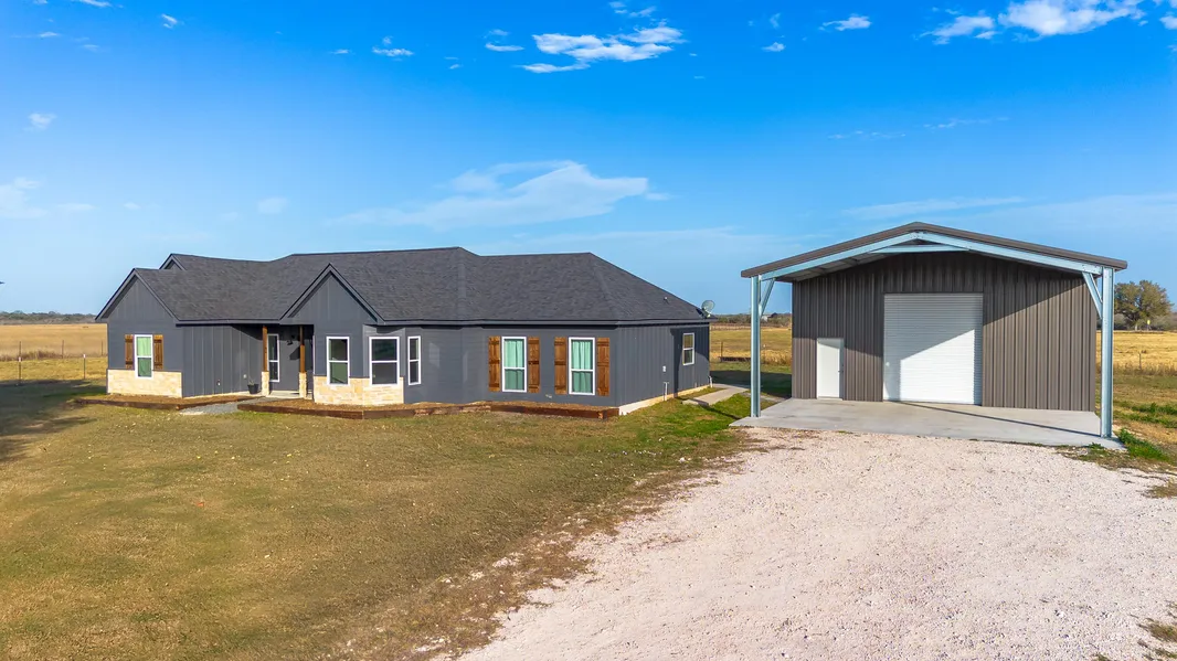 This stunning newly constructed custom home sits on 26.02 acres of picturesque land, featuring coastal grass pastures and beautifully scattered mature oak trees. Offering 4 bedrooms, 2.5 baths, and 2,171 sq. ft. of thoughtfully designed living space, this home boasts an open floor plan that seamlessly connects the living, dining, and kitchen areas-perfect for entertaining and large gatherings. Each bedroom is generously sized, featuring large walk-in closets and abundant storage throughout. The spacious primary suite is a true retreat, complete with his and hers walk-in closets, a luxurious en-suite bath with a large soaking tub, and a beautifully tiled walk-in shower. In addition to the home, the property includes a 30x40 shop with a covered carport and an RV hookup, making it ideal for hobbyists, storage, or extra convenience. With ample space, serene surroundings, and quality craftsmanship, this property offers the perfect balance of comfort, privacy, and functionality.