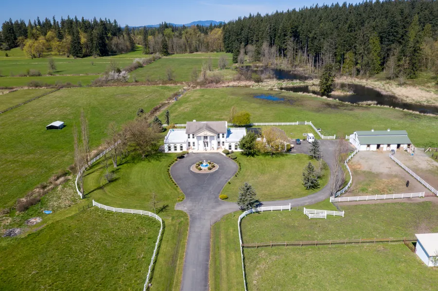 Elegant Estate with views of Mt Rainier. The gated entrance leads you by a picturesque white fenced pasture to a circular driveway. This home has stunning high-end finishes throughout, extensive woodwork, marble floors, soaring ceilings, large rooms, an elevator, gourmet kitchen. Main floor bedroom suite. The craftsmanship continues into the barn which includes guest quarters, the home sits on 26 acres, fishing pond behind the home. Plenty of space to socially distance. Endless possibilities.
