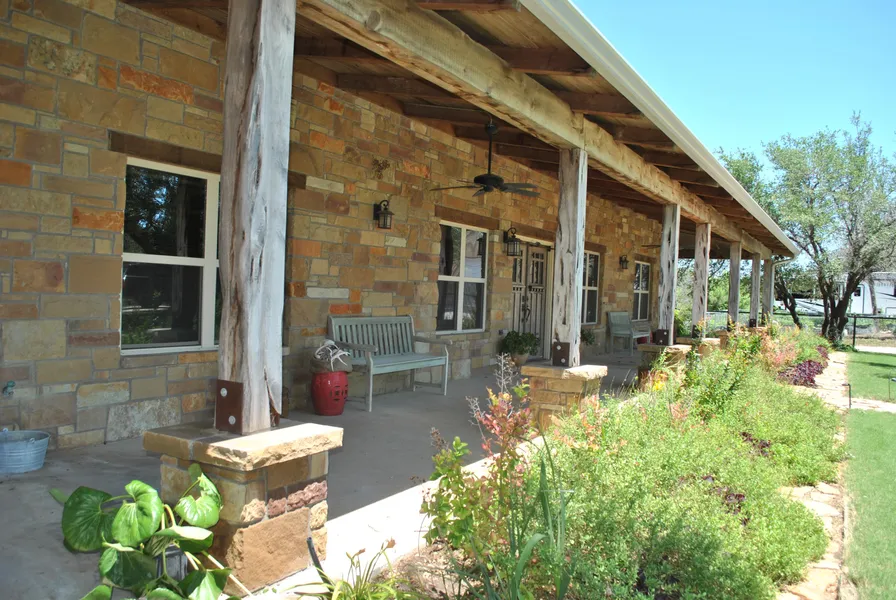 The exterior of the home features native San Saba sandstone and a standing seam metal roof. Enjoy panoramic Hill Country views and entertain guests on the oversized porch with a rock salt finish that wraps around the entire house. The porch, with a wood ceiling and cedar posts and beams milled in Johnson City, Texas, includes an outdoor shower off the master bedroom and an infrared ceiling heater outside the kitchen.