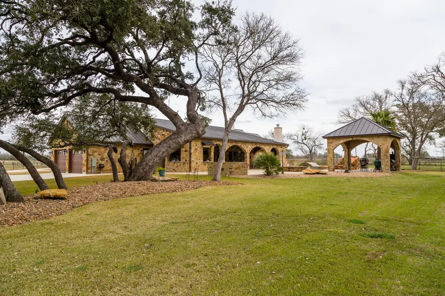 The outside of the home features many custom features, large open porches with a first class outdoor cooking area. A large wood burning fireplace with Flat screen TV is also located on the porch leading to the lagoon pool with hot tub. A spacious rocked palapa is located near the pool as well as an outdoor fire pit. The property features a water well that is used to water the landscaping around home as well as keeping the stock tank full. Public water supply feeds the home and barns. The new metal barn with attached carports is large enough for 8 large vehicles and features AC/heat. It includes a bathroom and a commercial car lift. The entire drive way from the entrance to the home has been poured in concrete to minimize future maintenance; a large electric operated gate adds privacy. New fencing has been added that separates the home from the acreage so that cattle/horses can easily be accommodated.