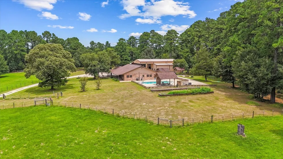 NEW PRICE 26 Ac Park Setting, Private, Nestled at the back of this Wonderful Hideaway, Well Built, Well Maintained, Single Story with Updates. Custom Home, Island Kitchen, Silestone Counter Tops, Gas Range, Dinning Area, Beautiful Great Room Exposed Vaulted Ceiling ,Abundant Widows and Natural Light. Engineered Hard Wood Floors. Isolated Owners Suite. 2 BDs w/ Hollywood BTH, Double Vanities, Cultured Marble. Home Office, Laundry Wet Room w/ 1/2 Bth. Great Entertaining Venue. Pool, Pavilions, Fire Pit, Pool Appointed 1/2 Bath. 50 x 50 Shop, 3 Oversized Overheads, Office, Kitchen, Bath, Bedroom, Shelving. 75 x 45 Concrete Apron Ideal for Equip, Trailers. 32 KW Propane Generator Carries Entire Compound. Cabin w/ RV Hook up. 14 ac OF Wooded Wildlife Paradise, Enjoy Spring Creek, Stocked Fishing Hole, Majestic Pines and Hardwoods w/ Hiking Trails ,RV Set Up. Fenced and SANDY Soil. This Gems has it all, Attention to Detail is Obvious, Great LOCATION . AG Exempt. Mins From Town.