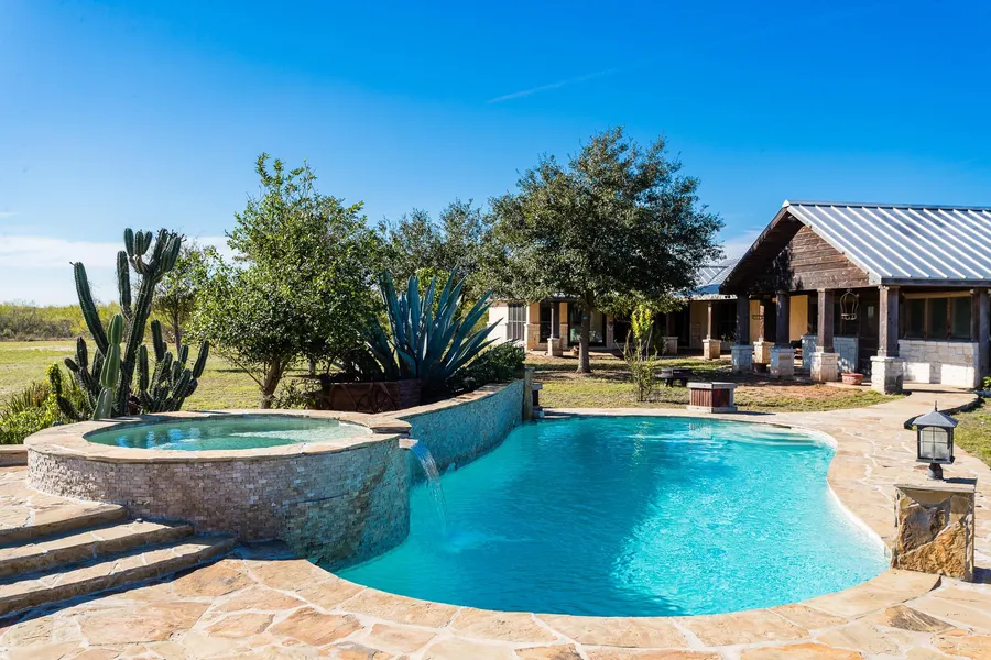 The main home is approximately 3000+ sq ft and has 4 bedrooms and 3.5 baths. It features a metal roof, stone and wood exterior, Carport, and extensive stone porches under roof. The interior of the home has large rooms, wood floors, and attractive finish outs. This home was designed for entertaining groups of family and friends comfortably. The home has a large kitchen with a stainless Wolf Oven and propane range and an island. It also has an oversized pantry that doubles as a laundry room. Thekitchen opens into a large dining area that looks out onto the patio and pool area. There is also a screened-in kitchen easily accessible from the dining room via the patio, with grill, fridge, island, and dining table. The pool is approximately 35,000 gallon and is 4 ft to 8ft in depth. There is an attached upper hot tub that looks out over the property. There is also a barn with 2 additional bedrooms and a bath in between. The barn has a built in game cooler. There is an un-assembled metal bldg. that will convey with the property. Once assembled, is should be approximately 2,400 sq ft. Seller not responsible for assembly but will leave the pipe and panels for the Buyer to construct. The property also comes with a 20ft shipping container.