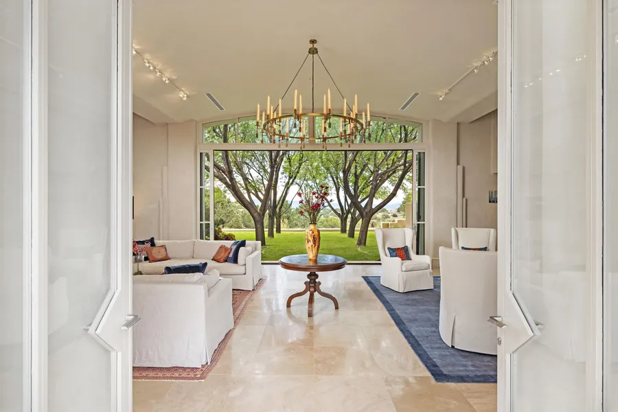Excellence in Santa Fe Modern Perfection.If you are looking for international sophistication in the American Southwest, this architectural masterpiece in Santa Fe, NM is just 15 minutes from world-class arts, performing arts and a restaurant scene worthy of consideration to adds. The estate consists of a main residence, guest house and fitness gym/studio featuring 4 bedrooms, 7 baths, approx. 7,850 total sq. ft. It is in the gated community of La Tierra Nueva, once part of the Charles Goodnight Ranch, and sited on 27+ rolling acres with magnificent wrap-around views of the Sangre de Cristo and Jemez Mountains and Northern New Mexico. The main house was custom designed by James Coady as a timeless, soft Southwestern Contemporary with a European flair, featuring two bedrooms and an office/third bedroom that open to the interior courtyards. The residence sits mid-point on The Headquarters Trail at the property's highest point, opening to a courtyard alle of Arizona Ash trees and adjacent to a formal terraced flower garden. The separate fitness gym/studio and one-bedroom guest house, designed by renowned contemporary architect Jeffrey Harner, is a stunning tribute to the surrounding mountain views and badlands towards Colorado. With sequestered equestrian potential and access to 38,000 acres of BLM land, this private estate is easily maintained from afar. It is a mere 15 minutes from the Santa Fe Airport and adjacent to the exclusive Club at Las Campanas.