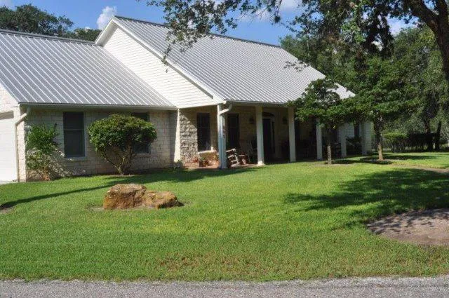 Secluded Paradise situated on 27.6 +/- acres with more available. Creek front home with 3 BR, 2 BA, study, 1 living and 2 dining in a gated neighborhood. Kitchen has sub-zero fridge (newer), Thermador range, custom solid wood cabinets throughout, Island kitchen open to living and dining. Beautiful Saltillo tile floors, cypress ceiling in entry, wood burning fireplace, Anderson windows, metal roof, stone exterior, sprinkler system and paved road to house. Exceptional 16 high barn with extra large doors and AC shop and more! Guest quarters included. 3 water wells. Complete backup generator system. So much more to share about this property!