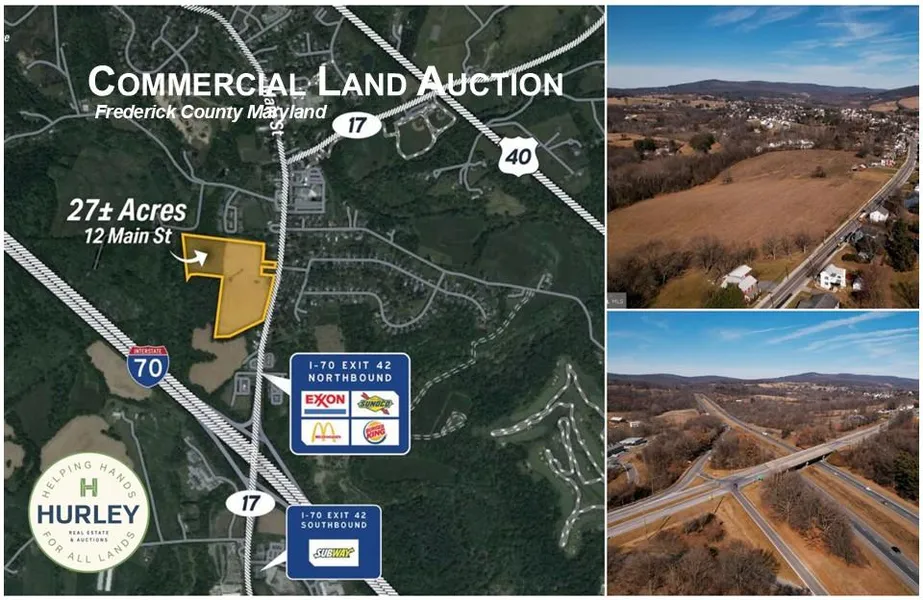 PRIME COMMERCIAL OPPORTUNITY IN MYERSVILLE, MD! Secure this high-visibility commercial land in the thriving corridor of Myersville, MD! Zoning permits commercial, high density residential and much more! Strategically positioned just 0.5 miles from I-70 with approximately 550 feet of road frontage and 27.13 acres on Main Street, this property offers unparalleled exposure to heavy daily traffic. Situated right off Exit 42, this is the only eastbound rest stop exit between Frederick and Hagerstown, ensuring a steady stream of travelers, commuters, and local traffic. Surrounded by national brands like McDonald's, Exxon, Sunoco, Burger King, and Subway, this location is primed for high traffic and consistent business flow. Zoned Village Center District, this property offers endless development possibilities. 5 ERU's included! Dont miss this rare opportunity to own a high-exposure commercial p...