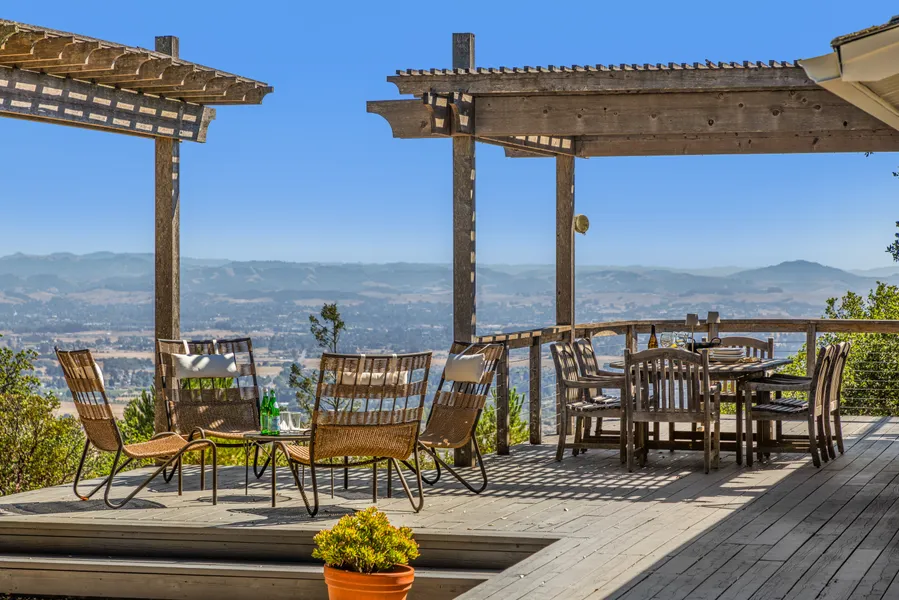 Welcome to this captivating farmhouse-style home nestled in the foothills of Taylor Mountain. With just one owner, this property is brought to market for the first time, offering an opportunity to enjoy serene living on 12+/- enchanting acres. Sweeping views from Cooks Peak to the San Francisco Bay, it reflects the timeless spirit of Sonoma County country living where open landscapes, rustic warmth & modern comforts meet. This single-level home features a thoughtfully designed space, featuring 2Br/2Ba w/ a 5 BR installed septic for future expansion if desired. Step outside to a wrap around porch uniting indoor living w/ stunning outdoor beauty, views & entertaining space. Wisteria -lined trellis, garden paths & custom pool create a serene oasis. Wander the garden paths to a detached home office. The custom hand crafted barn and tack room provide an open canvas for hobby pursuits or eques...
