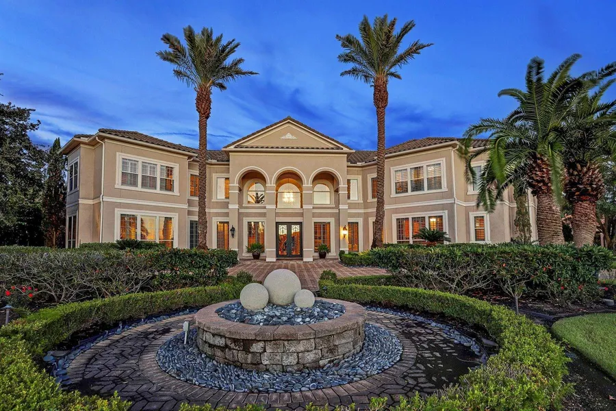 Estate w/lighted tennis court, putting greens, pool/spa/water feature + poolside “sports bar” on over 1 acre. Entry doors w/transom to 2-story entry w/chandelier & staircase. Gallery w/groin vault ceiling opens to LR/DR. Entertaining encouraged. Fireplace anchors 2-story LR w/views of backyard oasis. Master suite (Down) w/sitting room, spa inspired bath incl marble vanities, shower w/frameless enclosure, jetted tub, private WC & lg walk in closet. Adjacent exercise room or add’l mstr closet. B’fast room opens to family room & kitchen w/granite island +bar seating . Thermador appliances: 6-burner cook top w/ pot filler, 2 ovens, warming oven & microwave, 2 DW, & SubZero refrigerator/freezer. Resort style living at its best. Up: study connects to children’s playrm w/full bath +steam shower. Media & game/billiard rm, children’s homework area + 4 BR & 2 baths. Paved, circular, gated drive to...