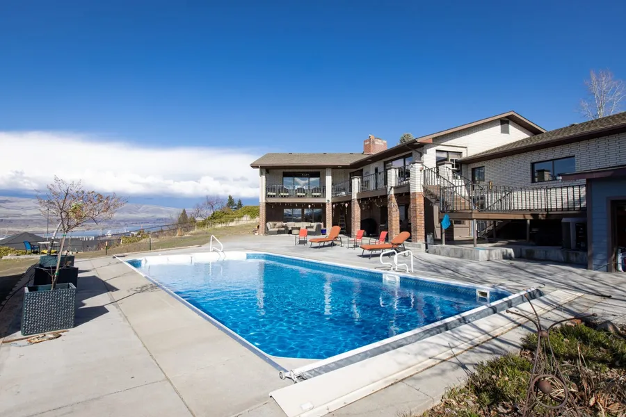 One of a kind custom built brick home with breathtaking views of the entire Columbia Gorge Valley. Private location on the end of a cul de sac adjoining the orchards, with fenced landscaped yard, a Koi pond, waterfall, hot tub and in-ground pool. Almost 7000 sq ft with two complete and separate living quarters, 2 kitchens, 6 bedrooms and 4.5 baths. Top of the line appliances, materials and LED lighting throughout. Brand new kitchen and bathrooms in lower unit. Elevator access between the two levels. Kubota BX2680 diesel tractor included. Multi-generational residence, adult care home, rental, the opportunities are limitless. By appointment only, showings require financing pre-approval or proof of funds. Seller will consider seller carried financing. No sign posted, no drive-bys please.
