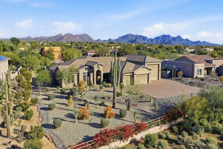 First resale available in this very special community! This meticulously maintained 3 BD + Den | 3.5 BA | 3,378 SF single owner 2019 new-build home is located in an intimate private gated community of only 13 homes, offering rare privacy, space, a huge RV garage and exclusivity on a 1.07-acre lot. Designed for seamless indoor-outdoor living, the resort-style backyard is an entertainer's dream featuring a fully equipped outdoor kitchen island, Wolf 42'' gas grill, EVO 30'' Affinity grill, Twin Eagles cooler, drawers, and storage, a built-in gas fireplace, Sundance spa, and Havana shades enclosing the patio for year-round enjoyment. Inside, the home showcases hand-troweled walls, wood plantation shutters, and a striking linear electric fireplace anchoring the great room. The chef's kitchen is outfitted with a premium Wolf and Sub-Zero appliance package, complemented by a whole-house water softener, reverse osmosis system, central vacuum, and an integrated security system with Ring cameras. The primary suite is a private retreat, offering direct access to the backyard oasis and a spa-like bathroom designed for relaxation. The luxurious bath features dual vanities, an expansive glass-enclosed shower surrounded by walls of glass, and a large soaking tub, creating a true resort-style experience. Convenient laundry access directly from the primary suite enhances everyday living. One guest bedroom features a private en-suite bathroom, making it perfect for visitors or multigenerational living. The home features a flexible den, ideal for a home office, media room, or additional living space. The garage setup is truly exceptional, featuring a 50-ft paver driveway, front-facing 3-car garage with 4-ft extension, plus a massive 53' x 21' RV garage offering 2,266 sq ft of usable interior space. Highlights include a 14' high x 17'8" wide RV door capable of accommodating the largest RVs, vehicle lifts, or collector car storage, four garage doors with openers and front & rear keypads, two 50-amp electrical outlets for RVs and electric vehicles, evaporative cooling, epoxy-coated floors, a rear toy door, and a dedicated garage central vacuum system. Impeccably cared for and rarely available, this like-new luxury home offers privacy, versatility, and resort-style living within a small, exclusive gated enclave.