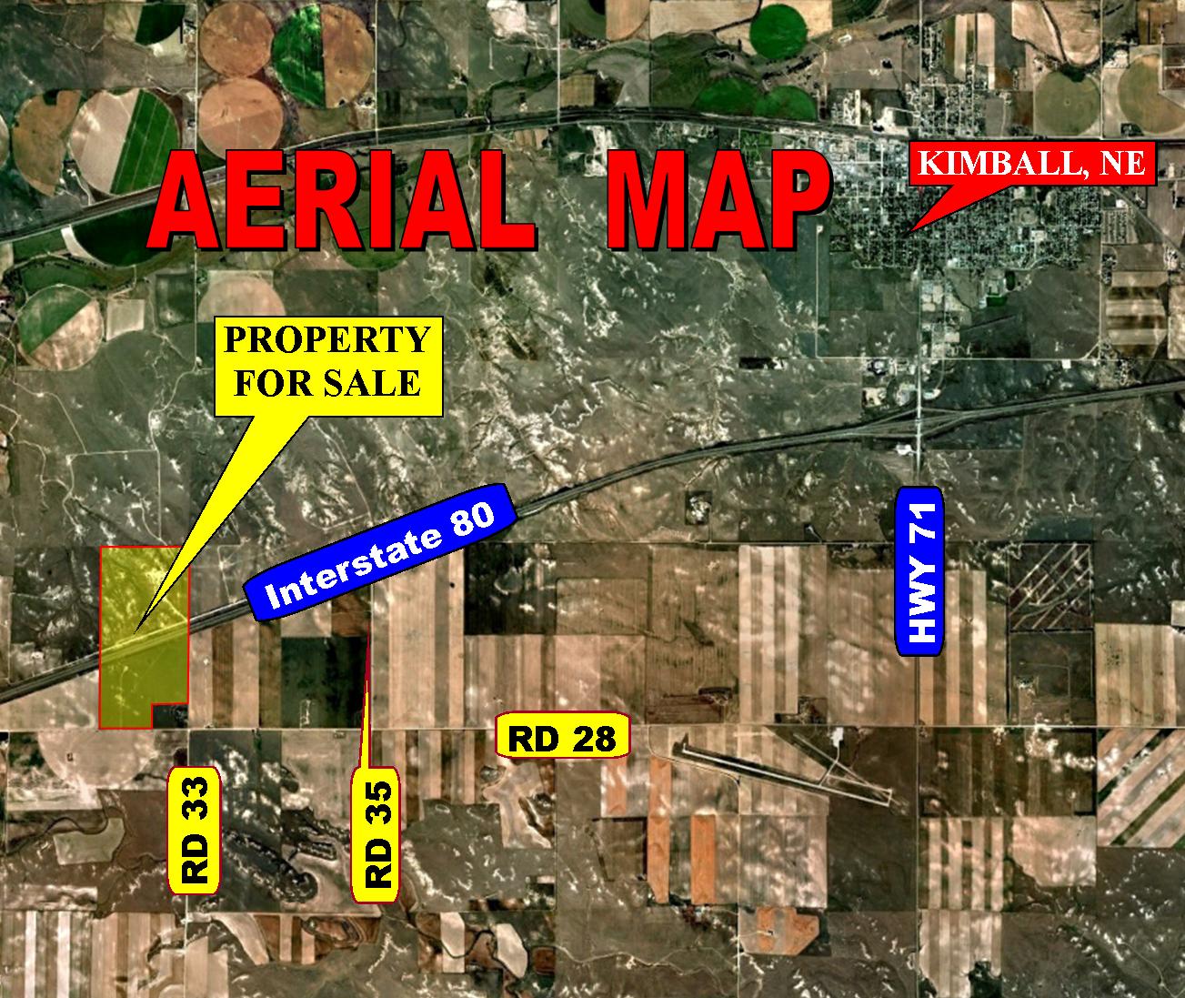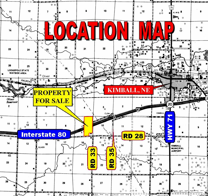LOCATION: From Kimball, NE, Hwy 71 S 3 miles to Rd 28, Rd 28 W 4 miles to Rd 33 to the SE corner of the property. Property (S of Interstate 80) lies on the N side of Rd 28 and the W side of Rd 33. To access property N of Interstate 80, travel 1 mile E to Rd 35. Rd 35 N 1 mile and cross Interstate 80 overpass. Turn W on access road (N of I-80) and travel 1 mile to the SE corner of the property.