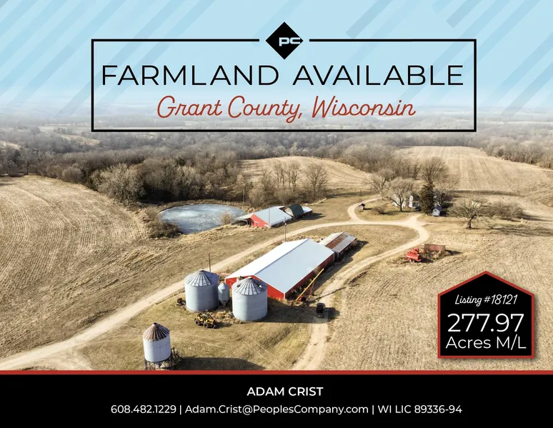 Peoples Company is excited to offer a prime opportunity to acquire 277.97 acres of top-tier farmland in Grant County, Wisconsin. Just minutes from Potosi, this property boasts 212.02 FSA cropland acres with a remarkable Productivity Index (PI) of 80.3. The Fayette silt loam soil type dominates the land, making it perfect for consistently strong crop yields.