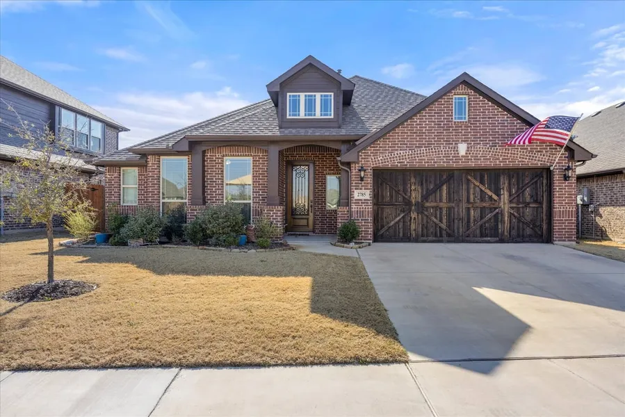 Welcome to the Carolina Plan by Bloomfield Homesa beautifully crafted single-story residence designed for modern living. This impressive home features an open-concept layout with 3 spacious bedrooms, 2 baths, and a dedicated study accessed from a dramatic rotunda entry. The striking exterior boasts Acme brick construction, an 8-foot tall mahogany front door with iron and glass detailing, and a durable cedar garage door. Inside, the deluxe kitchen is a chef’s dream, complete with quartz countertops, a mosaic tile backsplash, wood vent hood, pot and pan drawers, and built-in stainless steel appliances including a gas cooktop. The living areas are enhanced by durable laminate wood flooring, while the bedrooms offer upgraded plush carpeting and quartz counters in every bath. Enjoy both formal dining in an elegant setting and casual meals in a cozy breakfast nook featuring a buffet and window seat. The private yard is designed for year-round enjoyment, featuring two entry gates, stained fencing with metal posts, and an extended covered back patio. Additional exterior enhancements include front accent lighting, full rain gutters, and meticulously landscaped stone-edged flower beds.