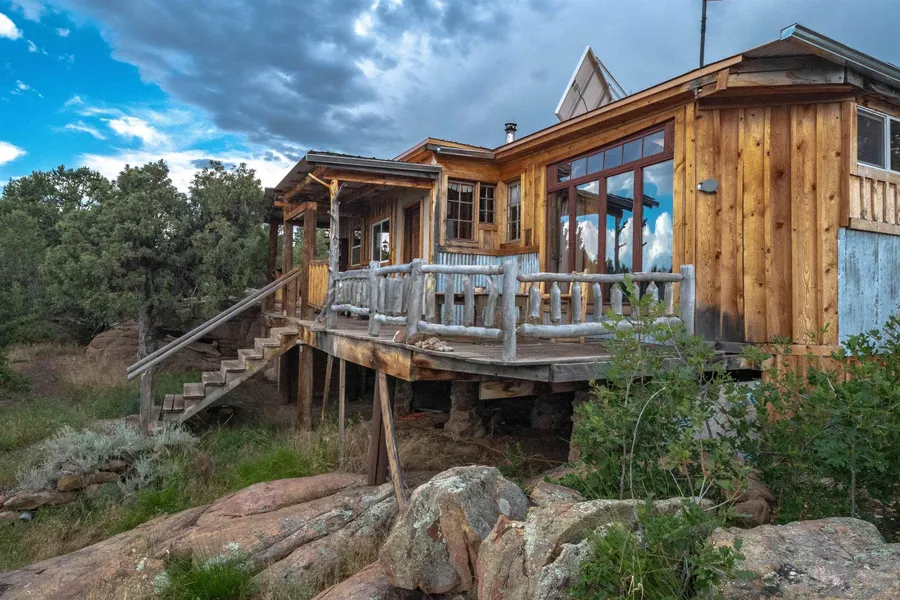 THIS PROPERTY IS ONLY AVAILABLE FOR SELLER FINANCING, AND AT INCREDIBLE TERMS! Please call for more details. Welcome to Ravens Rock! This is a truly magical 28.9 acre retreat nestled into the stunning beauty of Northern New Mexico. Perched among ancient Ponderosa pines, Pi?on and cedar trees, and sculptural rock formations, this one-of-a-kind, off-grid sanctuary includes a charming two-bedroom, one-bathroom cabin, an awe-inspiring guest treehouse, and a retro Airstream for additional space or creative use. Thoughtfully designed to blend into the hillside, the main home, approximately 1,800 square feet, offers stunning forest and mountain views from its expansive front deck. Inside, youre greeted by a hand-crafted front door and rich wood floors that carry a sense of warmth and craftsmanship throughout. The eat-in kitchen features abundant storage, a walk-in pantry, and a gas range that is perfect for off-grid culinary adventures. The main house has a beautiful soapstone woodstove, and there is even a brand new one, that is still in its shipping container, ready to go into the treehouse. Both bedrooms are outfitted with custom-built beds offering generous under-bed storage, and the bathroom features a freestanding soaking tub with shower, brand-new composting toilet for added ecological sustainability, and access to a large closet/storage area. The home's impressive off-grid infrastructure includes a powerful solar system backed by eight supercharged batteries, discreetly housed in a rear utility room, along with a 1,600-gallon water catchment tank integrated into the home. This back room was built as an indoor green house with large South-facing windows, and it has an office area with built-in desk and shelves. The homes plumbing is fully pressurized, and while the catchment system has proven more than sufficient, a well is believed to be feasible with water expected between 150190 feet below the surface. The home is being sold partially furnished. Tucked into the trees, the spectacular guest treehouse is a destination, and it is completely solar-powered and filled with forest charm. This treehouse is nestled literally into an 80-foot Ponderosa tree and is a must-see build. Nearby, the 1963 Avion travel trailer adds a dash of nostalgic flair and versatility to the property, perfect for guests, studio space, or a quiet retreat. Can outhouses be magical? At Ravens Rock, we believe they can. The property features two uniquely designed outhouses, each with its own unexpected charm. In addition to the main home and guest spaces, you'll find a thoughtfully designed workshop and storage building, with extra firewood and building materials neatly stashed behind, ready for your next creative project or homesteading task. A composting area behind the home supports your gardening ambitions, while thoughtfully placed benches throughout the property offer quiet spots for outdoor reflection, morning coffee, or sunset views. If all of this isnt enough, there a