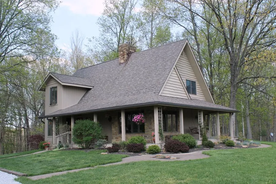 Perfect blend of home and property inspires creativity and encourages relaxation. Originally a builder's private home and has been wonderfully maintained. Cedar interior walls, cathedral ceiling, floor-to-ceiling Brown County stone fireplace. View from every window, porch and deck is incredible taking in almost 29 acs of private woods and pond. 21 acres placed in Classified Forest. Paths wander to screened summer house tucked in woods. Det. artisan studio, deer proof gardens. Horse potential.