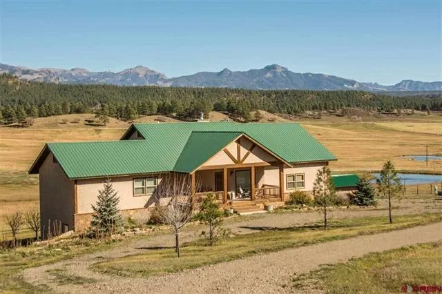 Reduced $50,000! Rare find! This property features, *Tremendous Views of the San Juan Mountains, *28 acre Horse property, *Water Rights, *Close to town, *No covenants, *Low maintenance home. Comfortable 2660 sf 4 bdr 3.5 ba home featuring 200 year old Pine flooring from a brewery in Atlanta, Moss rock wood burning Fireplace. Open kitchen to the dining room and large deck. Private master bedroom on main level, his and hers walk-in closets, double vanity and slate shower. The finished walk-out basement has a big family room, 3 bdrms plus office and gas log stove. The land of this lovely property is very lush and has a small barn with stall and hay storage. City water, Natural gas, Phone and Electric to the property.