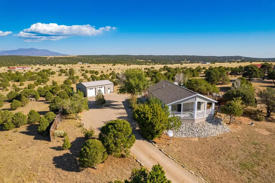 Nestled in the heart of Southern Colorado, this charming house offers a perfect blend of comfort and natural beauty. With 1,176 square feet of living space, this cozy abode features an open concept layout that maximizes functionality and flow. The home boasts two bedrooms and two bathrooms, including a primary bedroom with its own private 3/4 bath and an east-facing patio entrance - perfect for greeting the morning sun. A centrally located guest bath ensures convenience for all. The separate laundry area, complete with an on-demand hot water system, adds to the home's practical amenities. Step outside onto the wrap-around deck and prepare to be awestruck by the spectacular mountain views that surround you. The outdoor space is a true highlight, with a patio designed for gatherings, complete with a firepit and ambient lighting. It's the ideal spot for roasting marshmallows while sharing stories under the starry Colorado sky. Car enthusiasts and hobbyists will appreciate the oversized garage, which includes a workshop space and a woodstove for those chilly winter days. But the real gem of this property is its expansive lot - just under 5 acres of land enveloped by trees, offering privacy and tranquility in spades. This property also connects to a large subdivision greenbelt for added hiking space. Convenience meets natural beauty with community water access and county-maintained roads, ensuring you're never too far from modern amenities while still enjoying the serenity of rural living. This property truly embodies a fine place where you can breathe deep, relax, and call home.