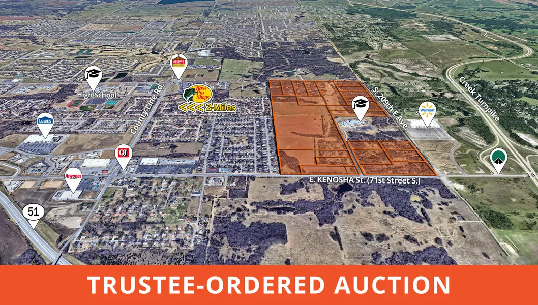Trustee-ordered auction of 280 total acres offered in 21 land parcels ranging from 5 to 80 acres ideally suited for residential development, commercial development or families seeking upscale homebuilding acreage within the East Broken Arrow expansion area. This premium, undeveloped land is ideally situated adjacent to Timber Ridge elementary school and Walmart Supercenter. The high school, middle school, retail, restaurants, entertainment, professional services, healthcare, Hwy 51 access, Muskogee Turnpike access and Creek turnpike access are all less than a 5-minute drive away.