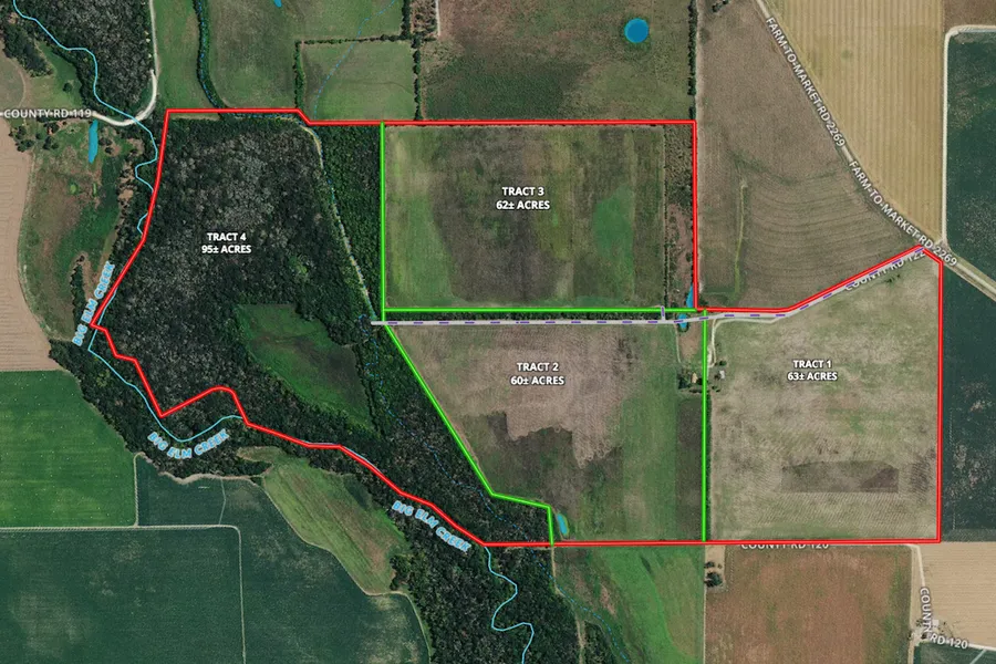 Offered in 4 Tracts, Tract 1 is 63 Acres, Tract 2 is 60 Acres, Tract 3 is 62 Acres, & Tract 4 is 95 Acres. Bidders can bid on any tract, any combination, or the whole farm.