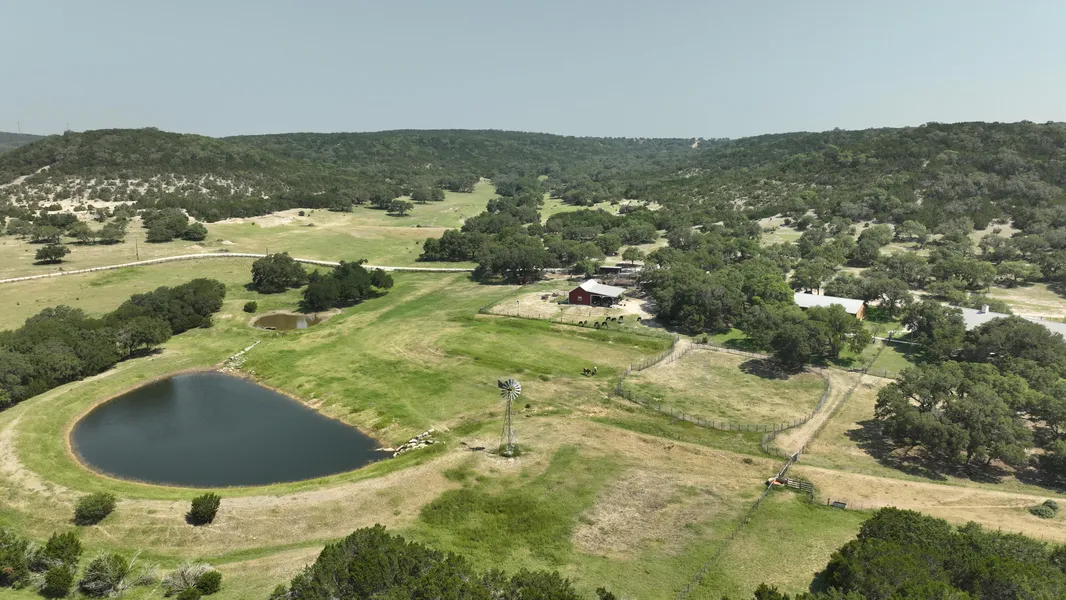 Improvements: This ranch has very practical improvements set up for the full enjoyment of its desirable Hill Country location. The 3-bedroom, 3.5-bathroom main house is nestled amongst a collection of grand live oak trees and has a full-length back porch along with a limestone patio with a built-in smoker and grill. The living room and kitchen are the focal point of the main house, with the natural light streaming into the great high ceilings of the open-concept gathering areas through large picture windows on each side. The kitchen is enhanced by a convenient utility kitchen. The primary bedroom has a connecting office/sitting room and a screened-in porch. There is a formal dining room and two additional bedrooms, each with ensuite bathrooms. The second smaller house has 3-bedrooms, 2-bathrooms and is great for additional guests or family use. This second house also has a full-length porch and a limestone patio with an outdoor fireplace. Other improvements include a hay barn and a charming historic red barn which provides storage for vehicles and tools, plus an office and a bathroom. The ranch has a low-fenced perimeter and a hay field that is crossed fenced for rotating cattle.