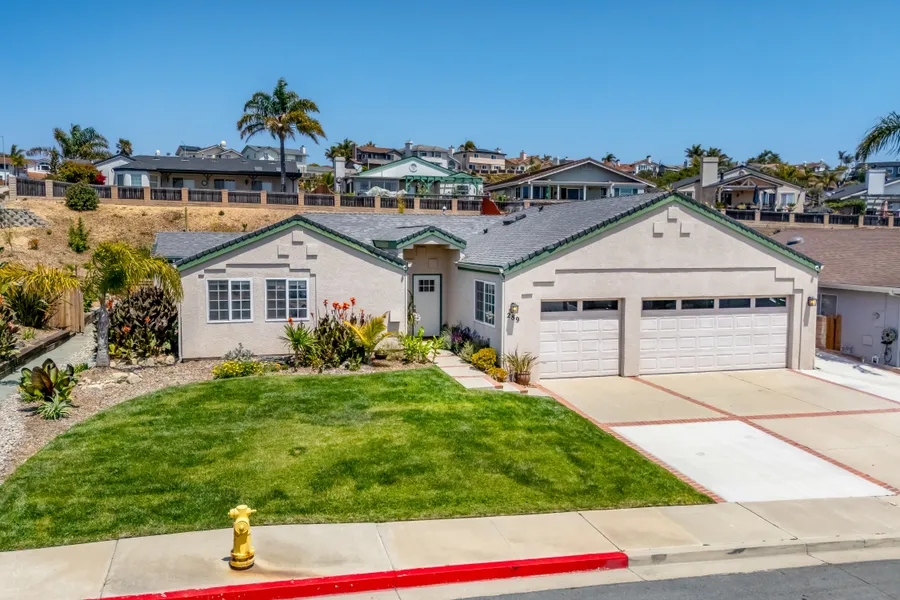 Coastal living at its best - Welcome to this beautifully updated single-level home in Pismo Beach set on just over 0.3 acres. With 1,849 sqft of living space, 3 bedrooms, and 2 bathrooms, this home blends comfort, style, and functionality in a highly desirable coastal location. Step inside to an open-concept living area filled with natural light and a cozy fireplace. The kitchen features a walk-in pantry, breakfast bar, and a separate dining area with access to the backyard, making it perfect for everyday living and entertaining. The freshly painted interior is enhanced by new luxury vinyl plank flooring throughout, updated light fixtures and ceiling fans, freshly painted cabinets, new blinds in living areas and new bathroom faucets. The spacious primary suite is a private retreat with direct access to the backyard, a large walk-in closet, dual sink vanity, and a separate tub with walk-in shower. Adding to convenience is the indoor laundry room enhancing the thoughtful layout and comfort of the home. Outside you'll find a private oasis; an expansive 13,000+ sq ft lot that is perfect for entertaining, gardening, or relaxing in the coastal breeze. A beautifully designed side yard features a stunning array of plants, flowers & trees creating a colorful landscape. You'll also enjoy a bounty of fruit and edible plants, including avocado, olive, pineapple guava, raspberries, boysenberries, tomatoes, and even kiwi. The backyard hillside has been strategically planted to create additional privacy in the backyard as the trees continue to grow. The property includes a spacious 3-car garage with plenty of storage, an extended driveway for ample parking, and additional side-yard space ideal for whatever your needs may be. Situated on an end lot of a well-established neighborhood, this home offers quick access to local amenities and the beach. It’s the perfect combination of space, updates, peek-a-boo ocean view and a prime location!