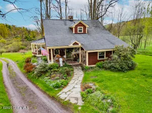 This charming 1826 farmhouse, set on 29.80 acres, offers stunning views of serene ponds and natural surroundings. Enjoy your morning coffee in the sunny sunroom or the lovely, curved sun porch. The upper-level features three bedrooms, including one with a walk-in closet and another with a loft, along with an open study and a full bath. The first floor includes a master bedroom or family room, a bright sunroom, a spacious living room, and a country kitchen with a pantry. Outside, the property features a three-stall horse barn, a chicken coop, and a loft, all surrounded by open meadows, 2 ponds and apple trees. This enchanting property combines rustic charm with breathtaking views, conveniently located just 15 minutes from the Vermont border and 45 minutes from Lake George.