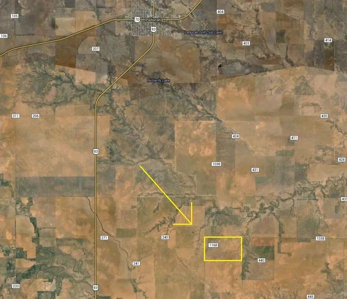 Research Parcel Informationfrom Paducah take FM 1038 South until it intersects with FM 1168. Property is located south of that intersection.