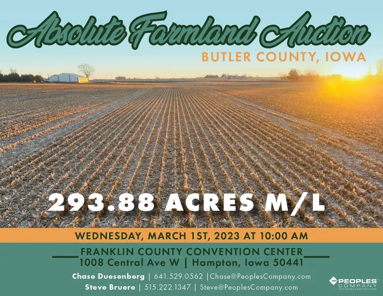 Absolute Butler County, Iowa Land Auction! Peoples Company is pleased to present 293.88 acres m/l of Butler County farmland located north of Dumont, Iowa. The farmland will be sold with 'No-Reserve' to the highest bidder at a live public auction on Wednesday, March 1st, 2023 at 10:00 AM at the Franklin County Convention Center.