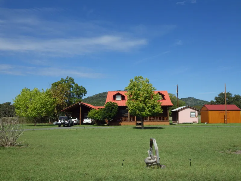 This cozy log cabin is situated on three manicured lots in the popular, gated, Twin Forks Subdivision. Situated in the back of the development these lots border larger acreage and have gorgeous views of hills from one of the two covered porches. There is a small attached guest house offering a half bath off of the back porch and two car carport. The main home has open living and dining to a good sized kitchen with one bedroom, bathroom and loft bedroom upstairs and a newly remodeled full bath downstairs. There is a large workshop currently used as a professional quilt studio and a large shed for storage, along with a fenced garden area. As a landowner you will have access to two beautiful Frio River park areas, which have some of the best Frio around! $179,900.
