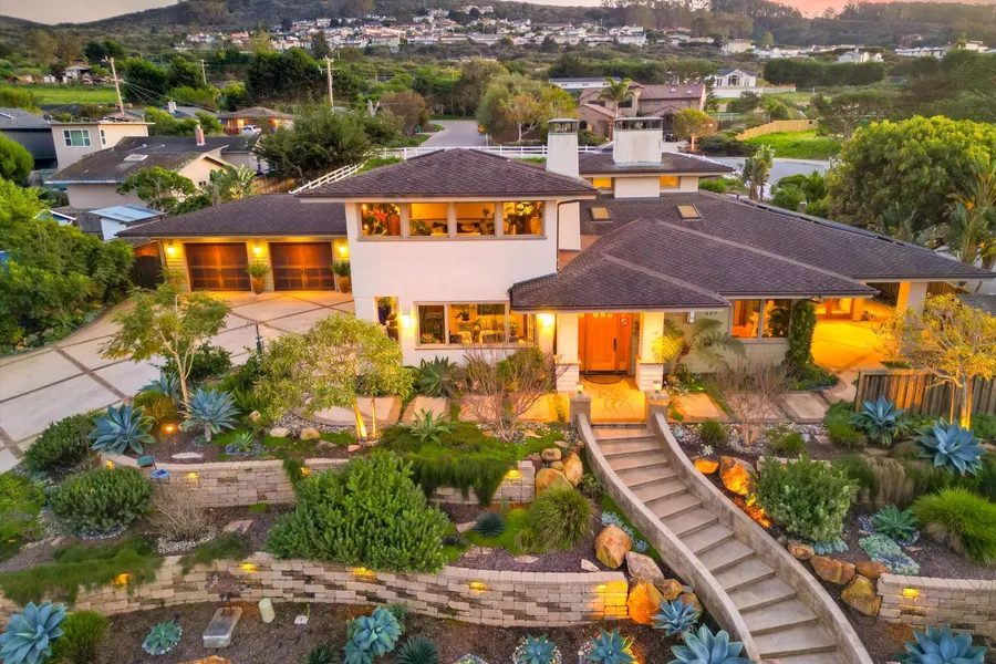 Welcome to 295 Mar Vista, a modern Craftsman offering four bedrooms and four full baths on an oversized corner lot with desirable northern and westerly exposure. Ocean breezes and layered privacy define the arrival, with custom paver walkways, concrete patios, sculpted garden walls, and an oversized stamped driveway leading to a three-car garage with wood-grain doors. Professionally designed grounds feature stone walls with integrated lighting and a fully water-efficient landscape with smart irrigation. Inside, soaring ceilings and abundant natural light highlight wide plank hickory wood flooring, skylights, crown molding, and custom Windsor windows with handcrafted casings. Hand-poured concrete fireplaces with embedded seaglass tile anchor the living spaces, while a central atrium with natural plantings and operable upper windows brings in ocean air. The kitchen is designed for daily li...